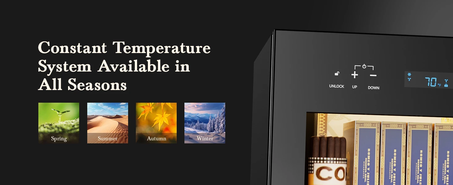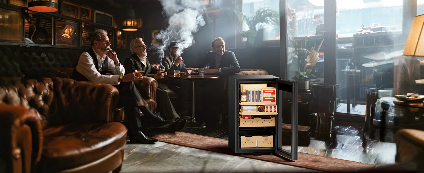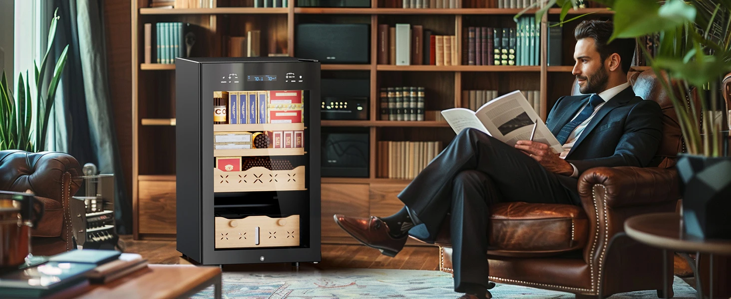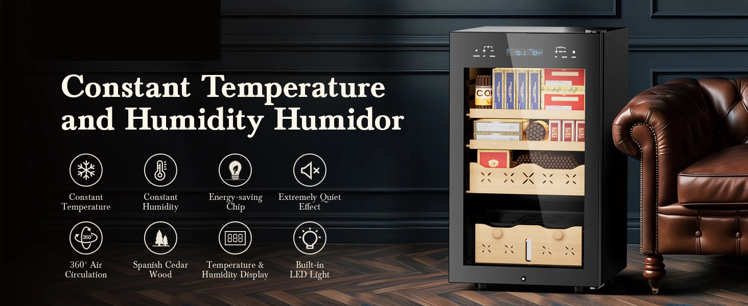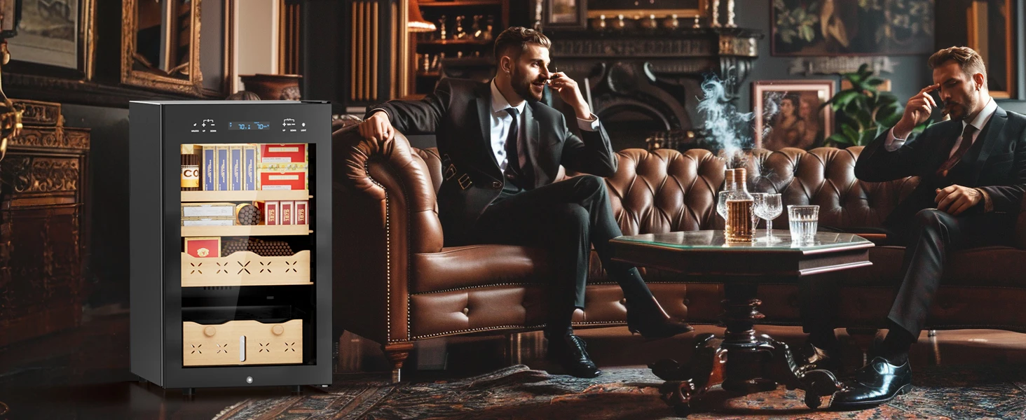 The 65L Electric Cigar Humidor 500 Counts Cigar Large Capacity Intelligent Temperature & Humidity Control Spanish Cedar Wood Drawer delivers advanced climate control with both cooling and heating functions to preserve up to 500 cigars in optimal conditions. Designed with Spanish cedar shelves, a digital LED touch panel, and automatic humidification, this premium humidor maintains 54℉–74℉ and 65%–75% RH consistently. Its compact, floor-standing design blends luxury and practicality, making it ideal for living rooms, lounges, offices, and cigar rooms.